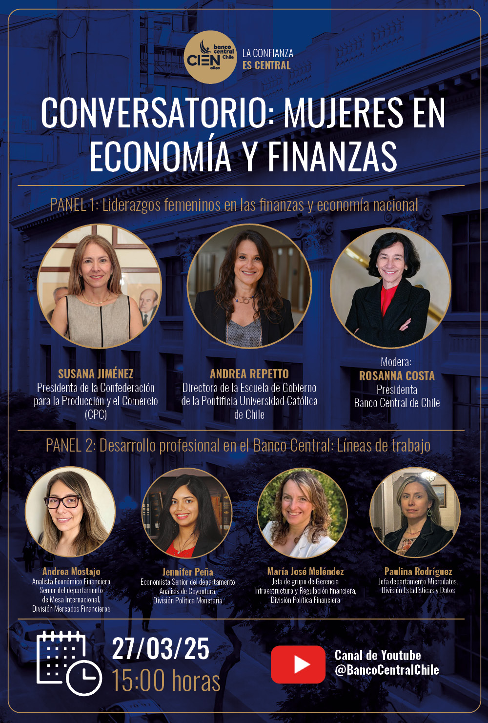 En su V versión, este año la actividad tendrá un sello especial, ya que se realizará en el contexto de los 100 años de la institución, fundada en 1925. Será moderada por Rosanna Costa, presidenta del Banco Central, y contará con la participación de Susana Jiménez, presidenta de la Confederación para la Producción y el Comercio (CPC), y Andrea Repetto, directora de la Escuela de Gobierno de la Pontificia Universidad Católica de Chile, junto con otras economistas que se desempeñan en el Banco Central de Chile.