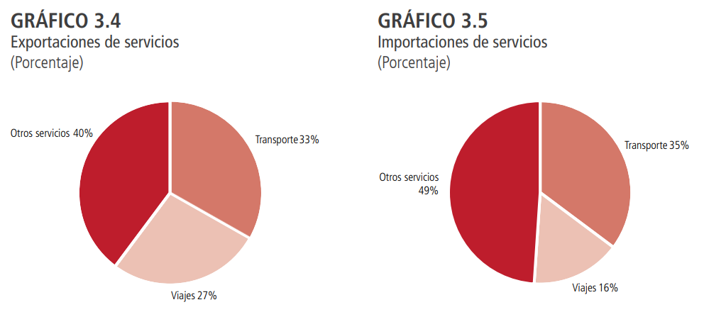 Los primeros consideran los prestados a través de cualquier vía (marítima, aérea, etc.), que incluyan el traslado de personas y bienes (fletes), arriendo de medios de transporte tripulados, servicios de apoyo y auxiliares relacionados a las naves y aeronaves, y servicios postales y de mensajería. La cuenta de viajes mide los gastos en bienes y servicios adquiridos en una economía, por parte de un viajero no residente durante su visita a dicha economía. Finalmente, la agrupación otros servicios incluye el resto, entre los cuales se encuentran los servicios de telecomunicaciones, informática e información, los servicios financieros y los servicios empresariales, profesionales y técnicos.