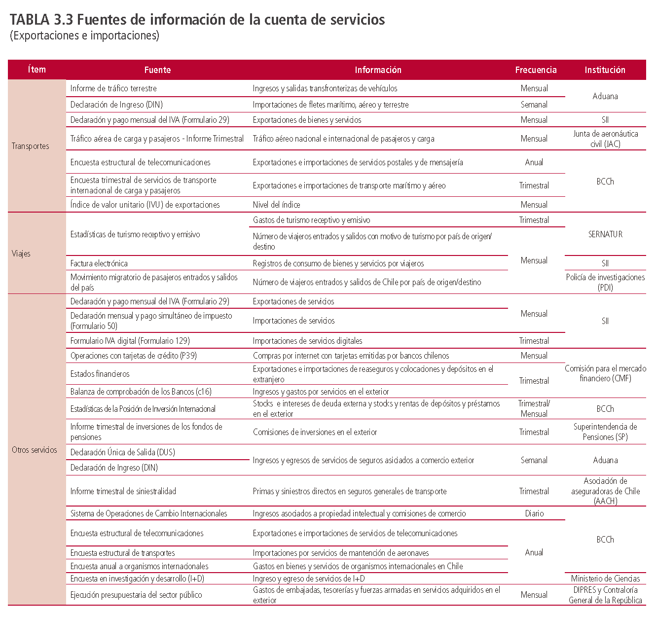 Las principales fuentes en la medición de servicios corresponden a registros administrativos, proporcionados por el SII y Aduanas, junto a reportes directos de empresas de transporte nacionales y agencias que operan en representación de compañías no residentes. Adicionalmente, se incluye información de encuestas levantadas por el BCCh y antecedentes de turismo emisivo y receptivo recogidos por el Servicio Nacional de Turismo (Sernatur).