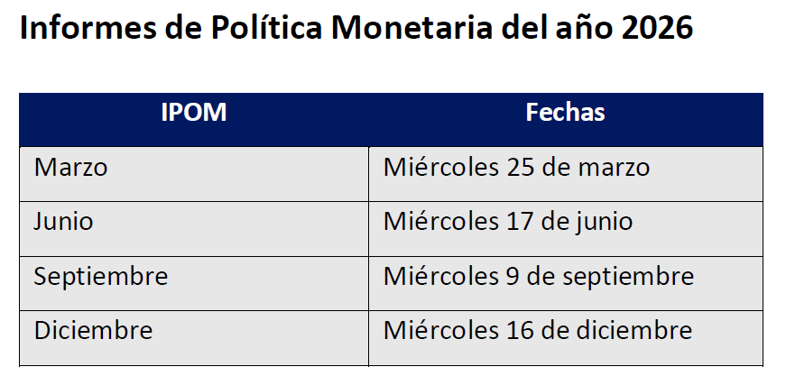 El Consejo del Banco Central de Chile informa las fechas de sus reuniones de política monetaria (RPM), informes de política monetaria (IPoM), reuniones de política financiera (RPF) e informes de estabilidad financiera (IEF) para el año 2026.