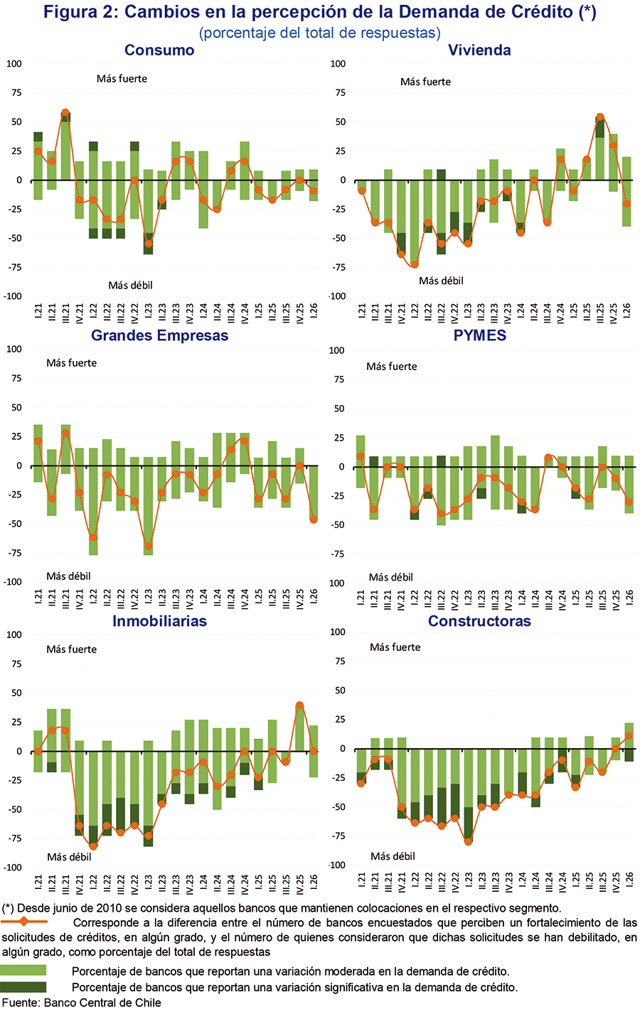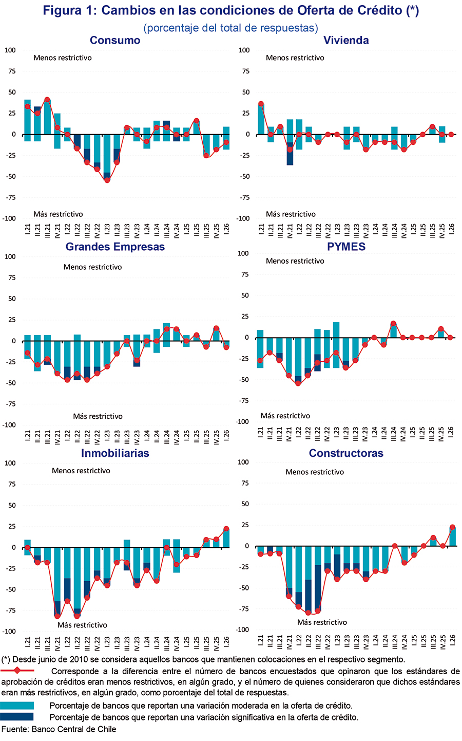 Esta encuesta fue elaborada a partir del levantamiento de las respuestas de los bancos entre el 17 y 31 de marzo de 2026, y tiene por objeto dar a conocer la percepción acerca de los cambios en los estándares de aprobación de nuevos créditos y en la demanda por financiamiento bancario durante el trimestre para el cual se realiza la medición. La encuesta es contestada por los ejecutivos responsables de las áreas de crédito de las instituciones bancarias en Chile. Así, los resultados permiten obtener antecedentes con el fin de comprender mejor los factores económicos y financieros que explican la evolución del comportamiento del crédito. Los datos de la Encuesta de Crédito Bancario se encuentran disponibles en la Base de Datos Estadísticos (BDE) del Banco Central. Para más información respecto al cuestionario con las preguntas de la encuesta y las cifras de los resultados agregados para el período 2003-2026, así como la metodología empleada, visitar la página web del Banco Central de Chile.