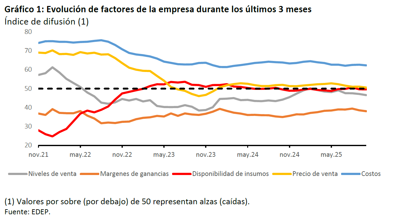 La evolución de los factores de las empresas muestra un escenario donde los precios de venta se mantienen sin variaciones en los últimos meses, en torno a la zona de neutralidad. Por otro lado, la percepción de aumento de costos se mantiene similar a los meses anteriores, mientras que, los niveles de venta y los márgenes de ganancia muestran una leve reducción (Gráfico 1).