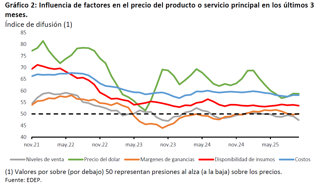 Respecto de la influencia de distintos factores sobre los precios de venta de los bienes y servicios ofrecidos por las empresas, la encuesta muestra que se reduce el efecto de los volúmenes o niveles de las ventas sobre dichos precios. Los márgenes de ganancia, por otro lado, se mantienen sin generar presiones.