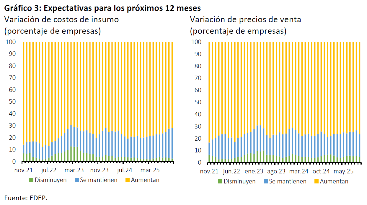 En el ámbito de las expectativas, se sigue reduciendo el porcentaje de empresas que espera un aumento en los costos de sus insumos, mientras que aquellas que esperan subir sus precios de venta en 12 meses más aumentan levemente¹ (Gráfico 3).