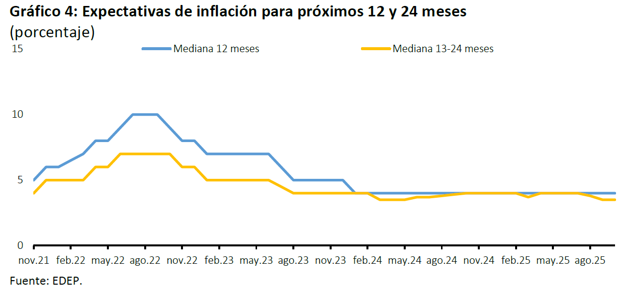 Las medianas de las expectativas de inflación de las empresas para los próximos 12 y 24 meses se mantienen en 4% y 3,5% respectivamente (Gráfico 4).