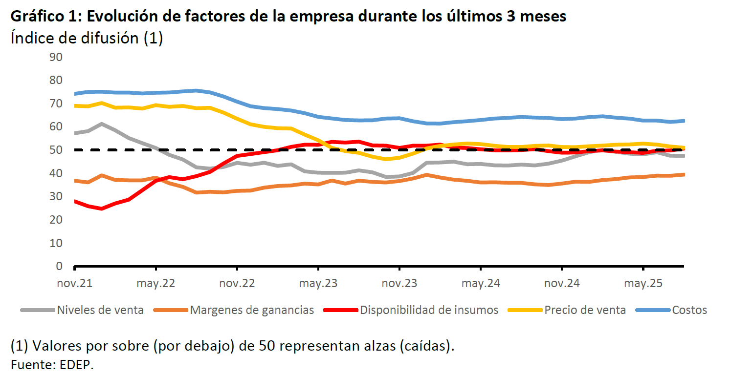 La evolución de los factores de las empresas muestra un escenario similar al de trimestre móvil anterior, con precios y niveles de venta que se mantienen en torno a la zona de neutralidad, junto a márgenes de ganancia que se mantienen sin variaciones relevantes. Por el lado de los costos, la percepción de aumento se acelera ligeramente, luego de las reducciones graduales observadas desde inicios de año (Gráfico 1).