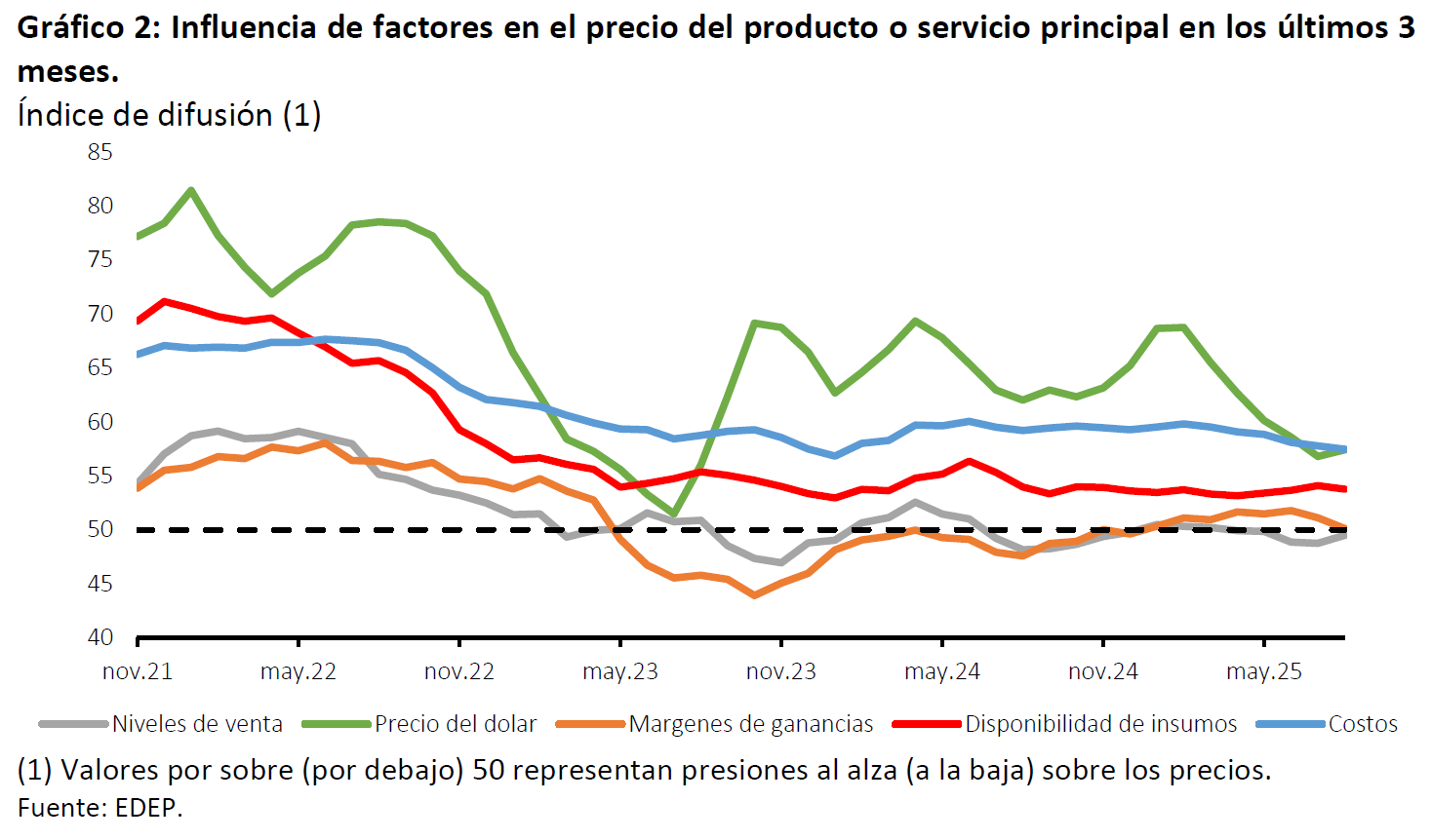 Respecto de la influencia de los distintos factores en los precios de venta de las empresas, los niveles de venta y los márgenes de ganancias se mantienen sin generar presiones. Tanto los costos como el precio del dólar generan influencia al alza de precios, mientras sigue reduciéndose en el caso de los costos, el tipo de cambio aumenta levemente sus presiones en relación con el trimestre móvil anterior (Gráfico 2).