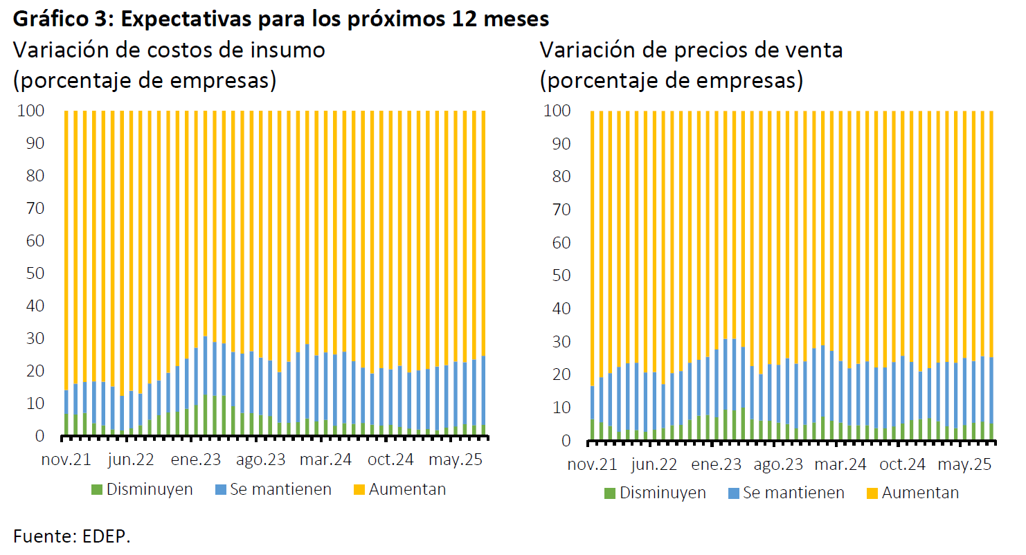 En el ámbito de las expectativas, se reduce el porcentaje de empresas que espera un aumento en los costos de sus insumos, mientras que se mantienen aquellas que esperan subir sus precios de venta en 12 meses más¹ (Gráfico 3).