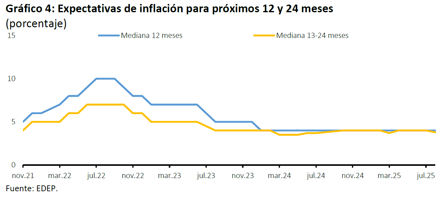 La mediana de las expectativas de inflación de las empresas para los próximos 12 meses se mantiene en 4% y a 24 meses se reduce, ubicándose en 3,8% (Gráfico 4).