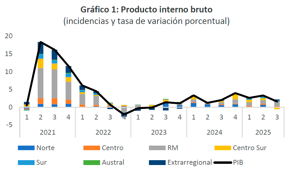 Considerando la descomposición del PIB por macrozonas (3), destacó la contribución de la región Metropolitana, seguida en menor medida por las de las zonas Centro (regiones de Coquimbo y Valparaíso) y Sur (Araucanía, Los Ríos y Los Lagos). En contraste, la zona Centro Sur (Libertador General Bernardo O’Higgins, Maule, Ñuble y Biobío) presentó la mayor incidencia negativa (Gráfico 1).