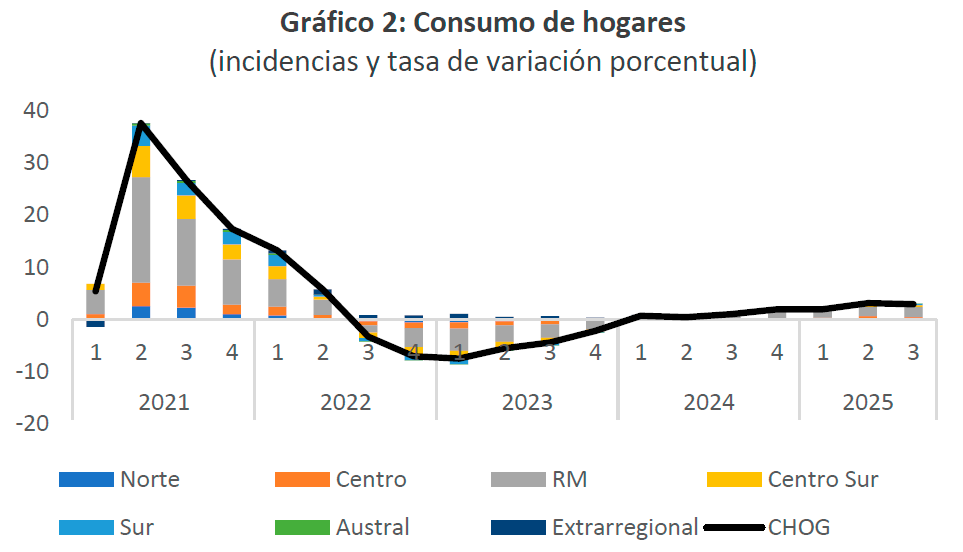 Por su parte, el consumo de los hogares fue incidido positivamente por todas las macrozonas, registrándose en la región Metropolitana la mayor contribución a este resultado, seguida por la zona Centro Sur (Gráfico 2).