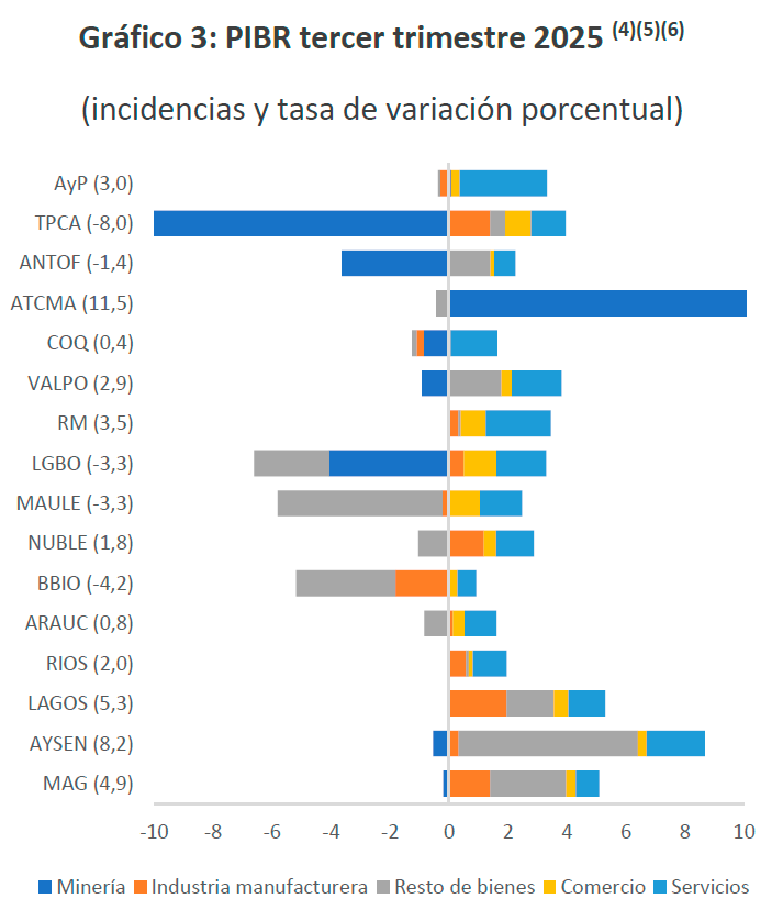 De acuerdo con la información preliminar de las Cuentas Nacionales, durante el tercer trimestre de 2025, once de las dieciséis regiones del país registraron crecimientos en su actividad económica, aportando al alza de 1,6% del total de la economía. Por su parte, quince regiones presentaron incrementos en el consumo de los hogares, contribuyendo al crecimiento de 2,9% nacional.