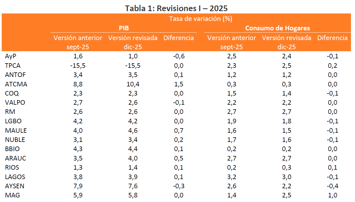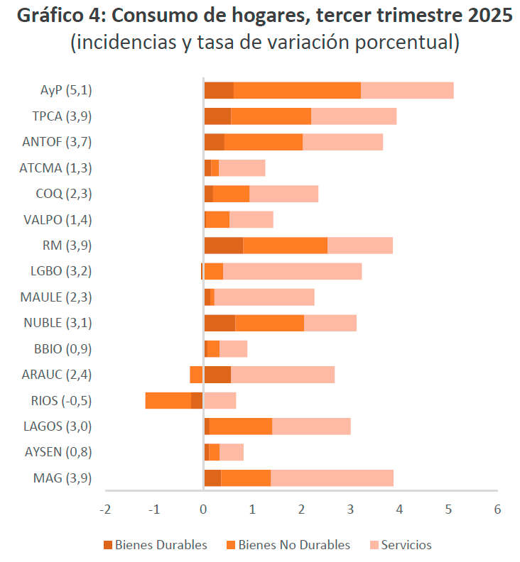 La región del Biobío se contrajo 4,2%, afectada por una menor disponibilidad de agua para la generación eléctrica en el resto de bienes. Adicionalmente, la industria manufacturera también registró una caída, incidida por la industria pesquera y de la producción de celulosa. El aumento en las actividades de servicios personales compensó parcialmente los resultados anteriores. El consumo de los hogares, por su parte, mostró una variación de 0,9%, explicado por el consumo de servicios, seguido por el gasto en alimentos, bebidas, vestuario y calzado dentro de los bienes no durables.