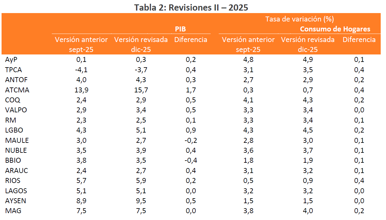 La región de Ñuble registró un incremento de 1,8%, explicado por los servicios, principalmente los personales, y por la industria manufacturera, impulsada por la producción de celulosa y alimentos. El consumo de los hogares, por su parte, creció 3,1%, con aportes de todos sus componentes, destacando el gasto de alimentos, bebidas, vestuario y calzados dentro de los bienes durables. También contribuyó el mayor consumo de servicios, impulsado por los servicios personales y el transporte.